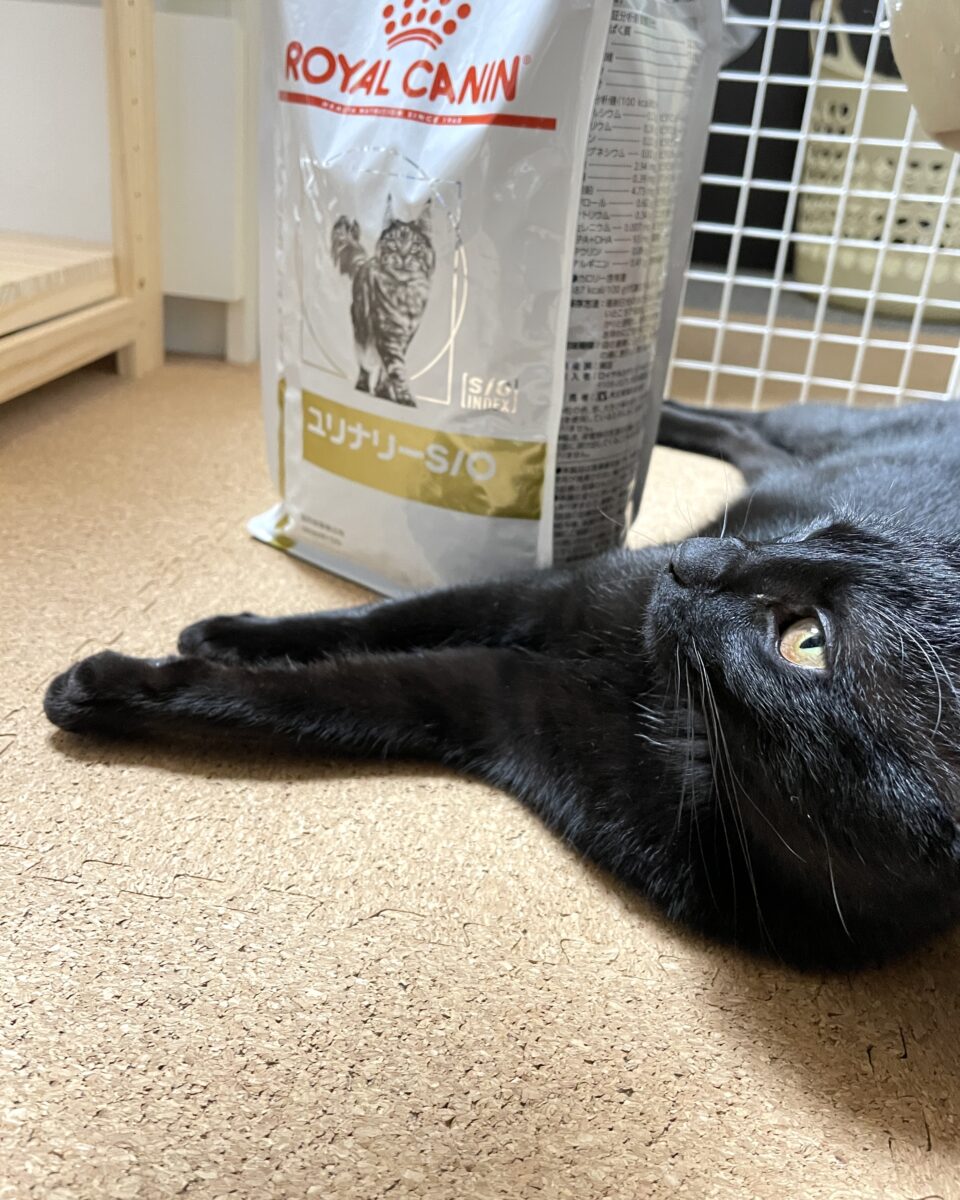 「これ以外は食べさせないでね。ちゅーるとかもダメだし、ウェットフードと混ぜたり上からスープ系のものをかけたりしてもダメ。療法食の意味がなくなっちゃうからね」とのこと。厳しいぞこりゃ。