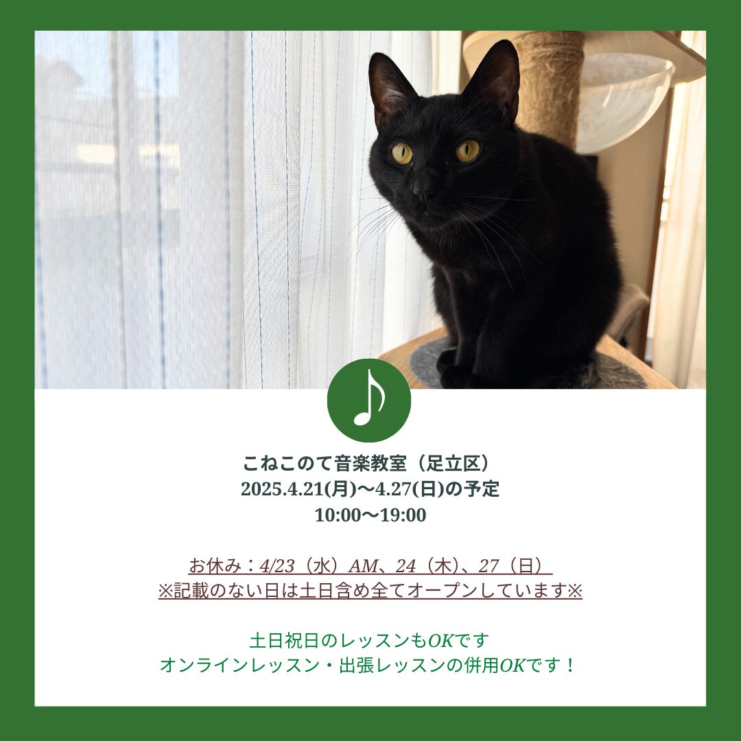 こねこのて音楽教室(足立区)明日4/21(月)は10:00〜19:00オープンです。