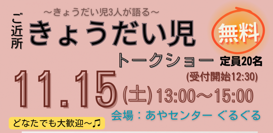 「ご近所きょうだい児トークショー」in あやセンター ぐるぐる、に登壇します!