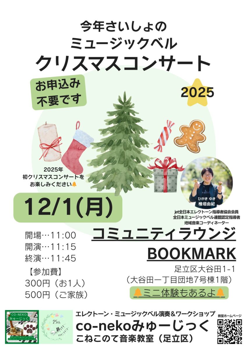 私にとっても今シーズン初!ということもあり、「今年さいしょのミュージックベルクリスマスコンサート」というタイトルを準備しました。
