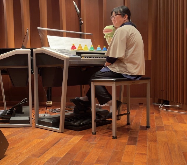 教室マスコットキャラクターのケロたんと一緒に、右手でミュージックベル、左手とベースはエレクトーンを演奏したのでした