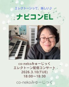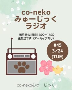 - 3月24日(火)「co-nekoみゅーじっくラジオ」 毎月恒例のラジオ配信。今月のテーマは……当日のお楽しみ!