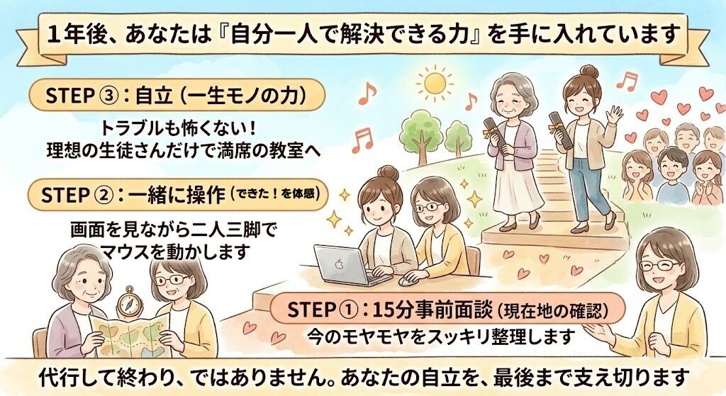 本サービスは、1年後にあなた自身が「自分一人で解決できる力(一生モノの力)」を手に入れていただくための伴走サポートです。画面を共有しながら「ここをクリックしてください」と丁寧にお教えしますが、マウスを動かすのは先生ご自身です。「自分で自分の教室を良くしたい」というお気持ちのない方、すべて丸投げをご希望の方はお力になれません。