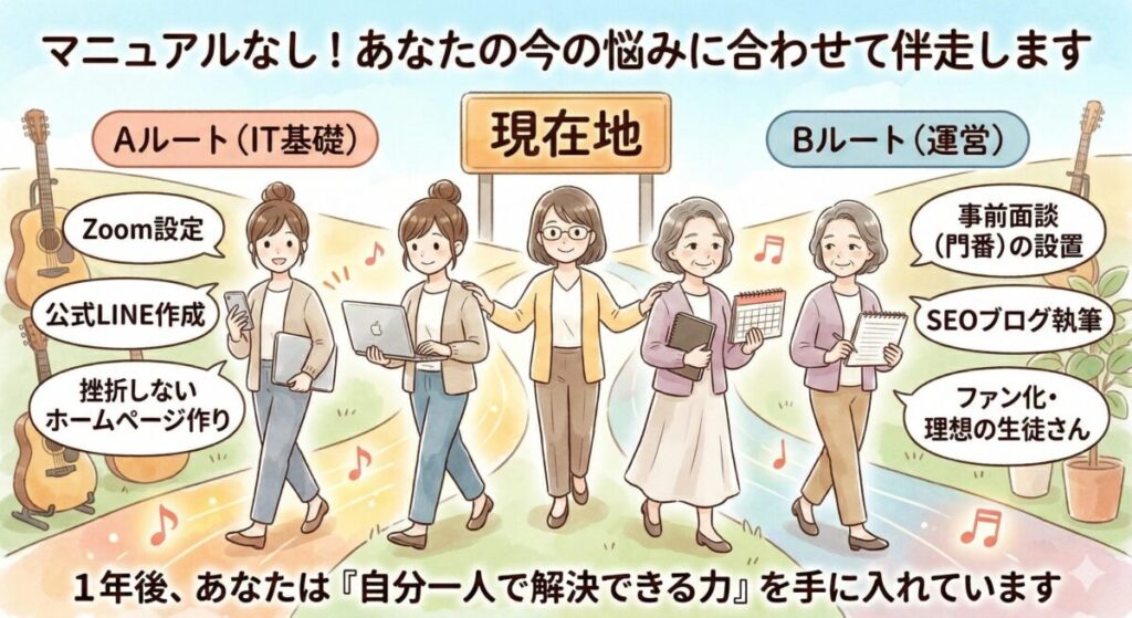 教室の数だけ、先生の数だけ、輝く「自分だけの音楽教室」の形は違います。だからこそ私がお約束するのは、冷たい「マニュアル」や大量集客の「テンプレート」を渡すことではありません。