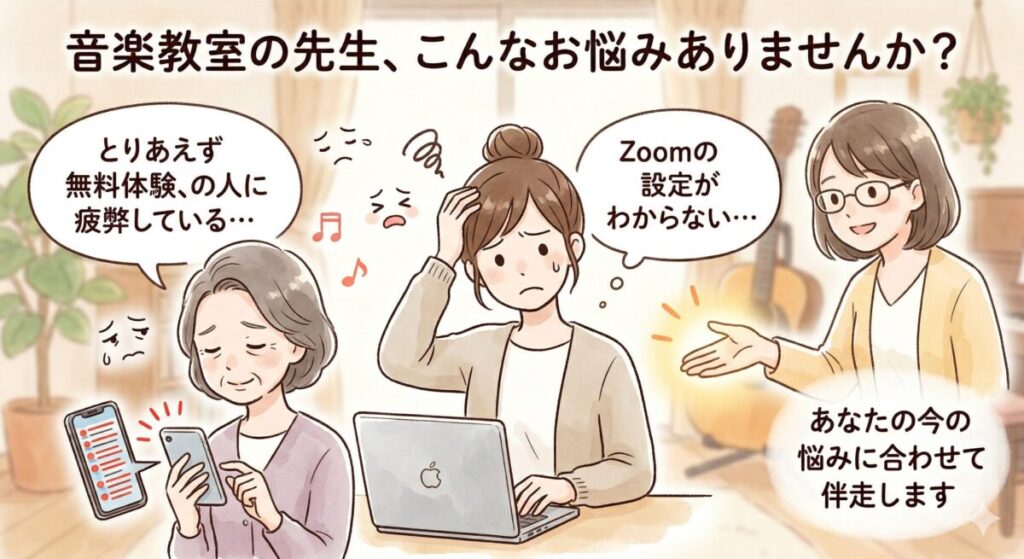 「ITが苦手だから…」「マイナーな楽器だから…」と諦める必要はありません。「生徒さんのために頑張りたい!」というお気持ちさえあれば大丈夫です。 音楽教室運営26年!の私が一番の味方となり、あなたの現在地に合わせた完全オーダーメイドで伴走します。