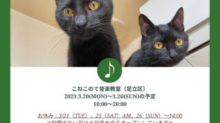 こんにちは(*^-^*)東京都足立区でエレクトーン教室・ミュージックベル教室を開いております「co-nekoみゅーじっく・こねこのて音楽教室」の檜垣(ひがき)です。毎週日曜日に、来週の教室オープン日、おやすみの日をお知らせしております。3/...